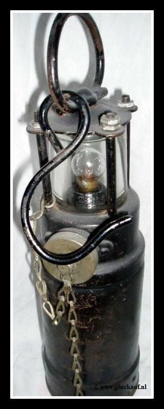 Info: Schroefdraad sluiting. Bleiaccu 2 V. Deze potlampen werden veel gebruikt op de Staatsmijn Hendrik & Oranje Nassau Mijnen.
