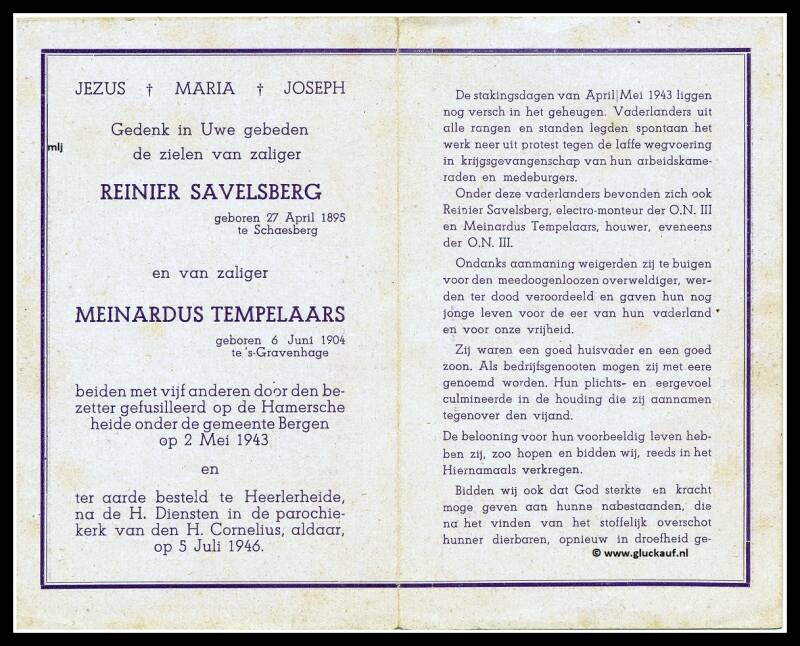Bidprentje van Reinier Savelsberg en Meinardus Tempelaars, beiden werkzaam op de ON III en gefusilleerd met vijf anderen in Bergen op 2 mei 1943.