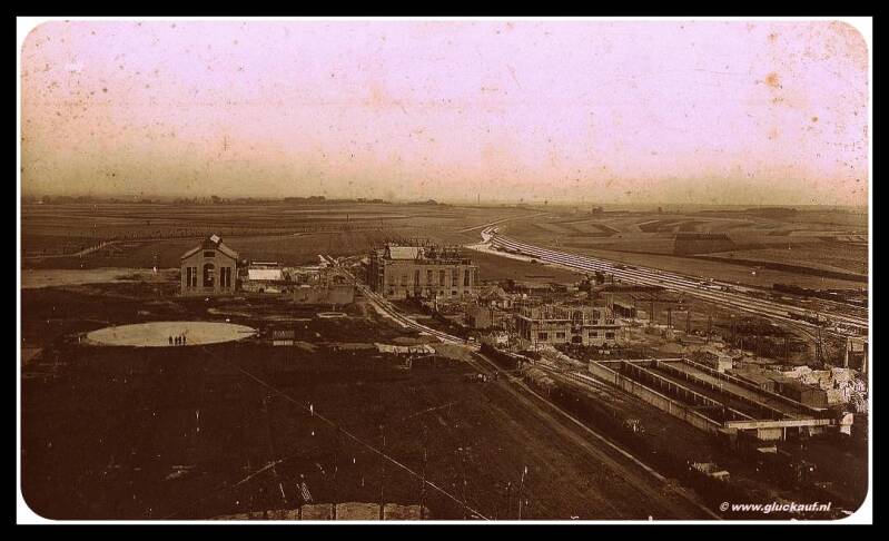 De bouw de van voormalige cokesfabriek Emma, in Treebeek in 1914. In de verte op de foto zie je nog Stm. Hendrik. Ook zie je duidelijk op de foto dat Treebeek grotendeels onbebouwd was.