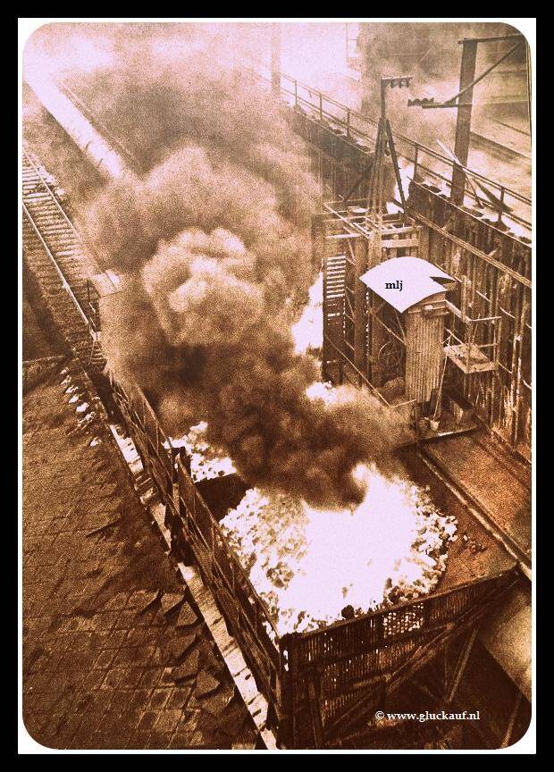 Gloeiende cokes in een bluswagen. Deze werd op 30 okt.1947,weer in bedrijf genomen.