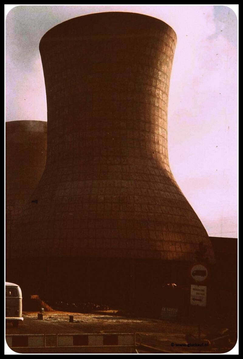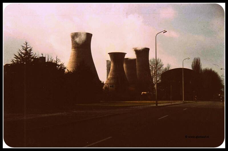 Kleurenfoto van de "van Iterson" koeltorens van de Stm. Emma, de foto is genomen in de jaren 70.© Bauten./www.gluckauf.nl