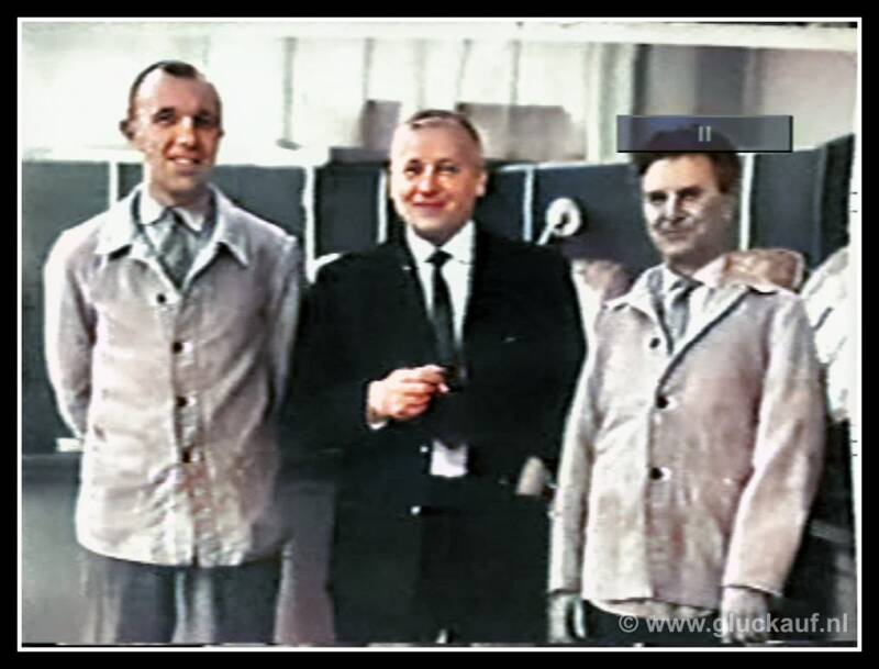 Portretfoto van de portiers van de voormalige Staatsmijn Emma. De foto is uit 1954-55. Ingekleurde foto.