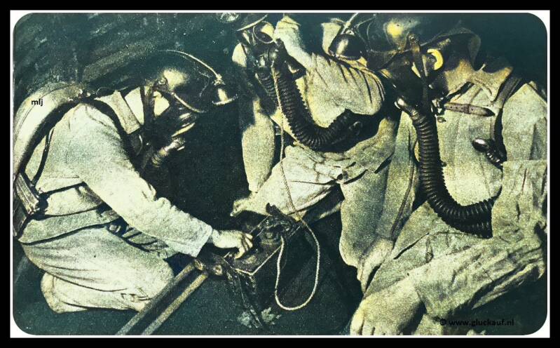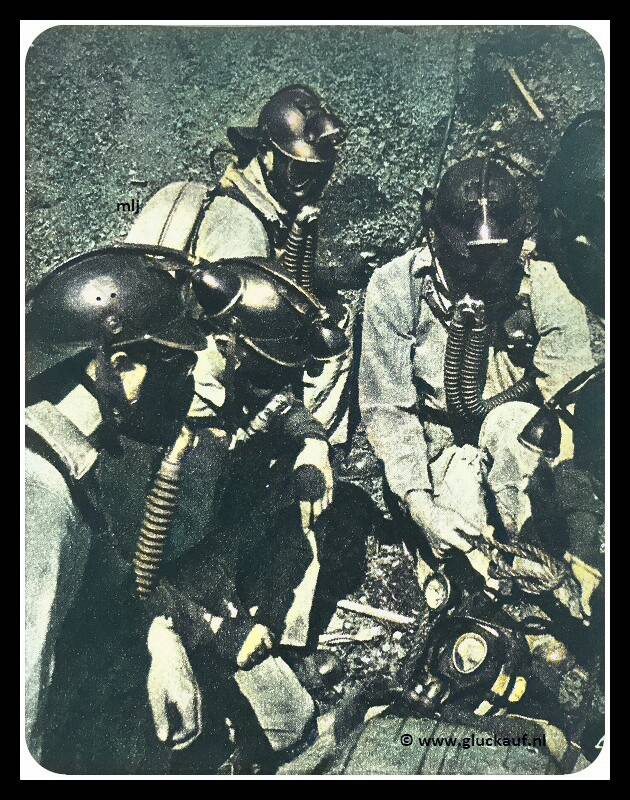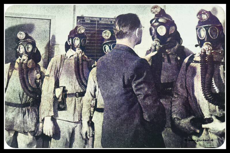 Telefoneren met een masker op is niet gemakkelijk. In de leermijn, waar we een reddingsploeg van Stm. Emma hier zien oefenen met een veldtelefoon, doet hiervoor de nodige ervaring en handigheid op. Foto is uit 1949.