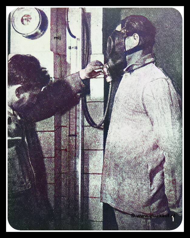 In het reddingsgebouw wordt de training voortgezet. Voor het binnengaan in de rookkamer controleert de ploegleider de alkali - patroon die de uitgeademde lucht zuivert van koolzuur en waterdamp. De patroon moet warm aanvoelen, is ze koud, dan moet ze direct verwisseld worden. De foto is uit 1949.