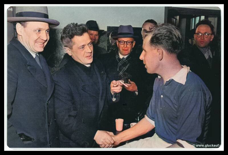 Speler van het kampioen elftal van S.V. Limburgia uit 1949-1950, wordt gefeliciteerd met het behaalde Nederlands Kampioenschap.