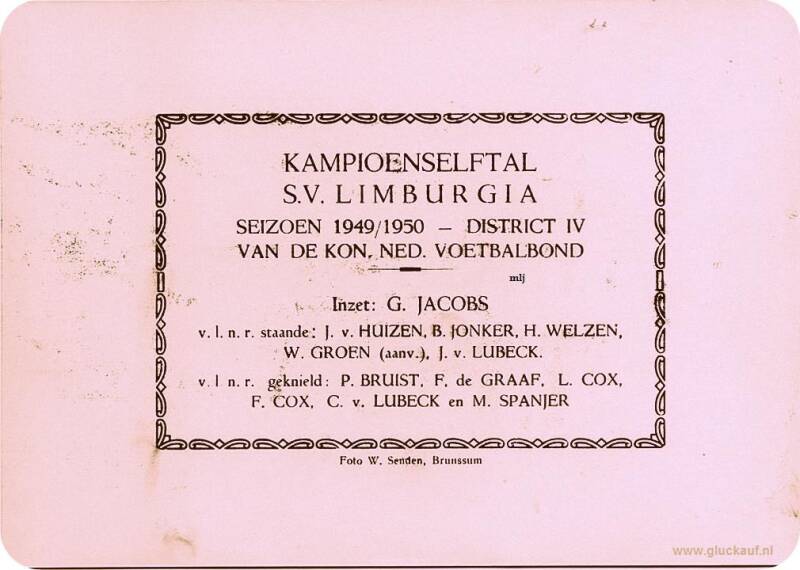 Hieronder kunt u het complete en unieke 36 pagina's dikke Jubileumboekje van de voetbalclub S.V. Limburgia lezen, de mijnwerkers-club die in het jaar 1949-1950 tevens Landskampioen van Nederland werd.