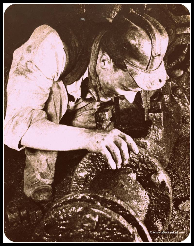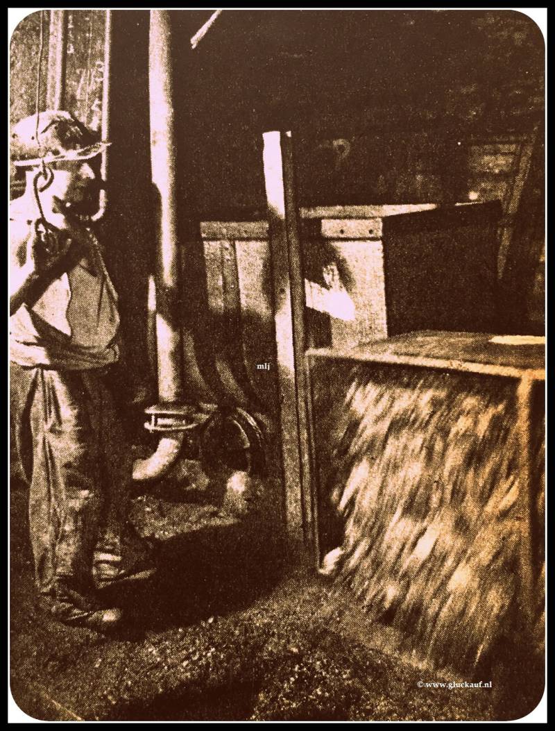 Houwer de Brie achter de strooilepel . De stenen haast onzichtbaar spuiten uit de leiding . Uit 1949. © Cals/www.gluckauf.nl