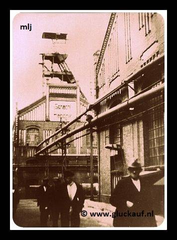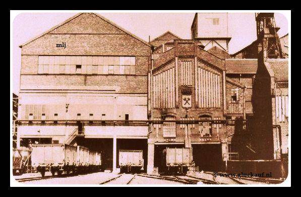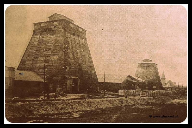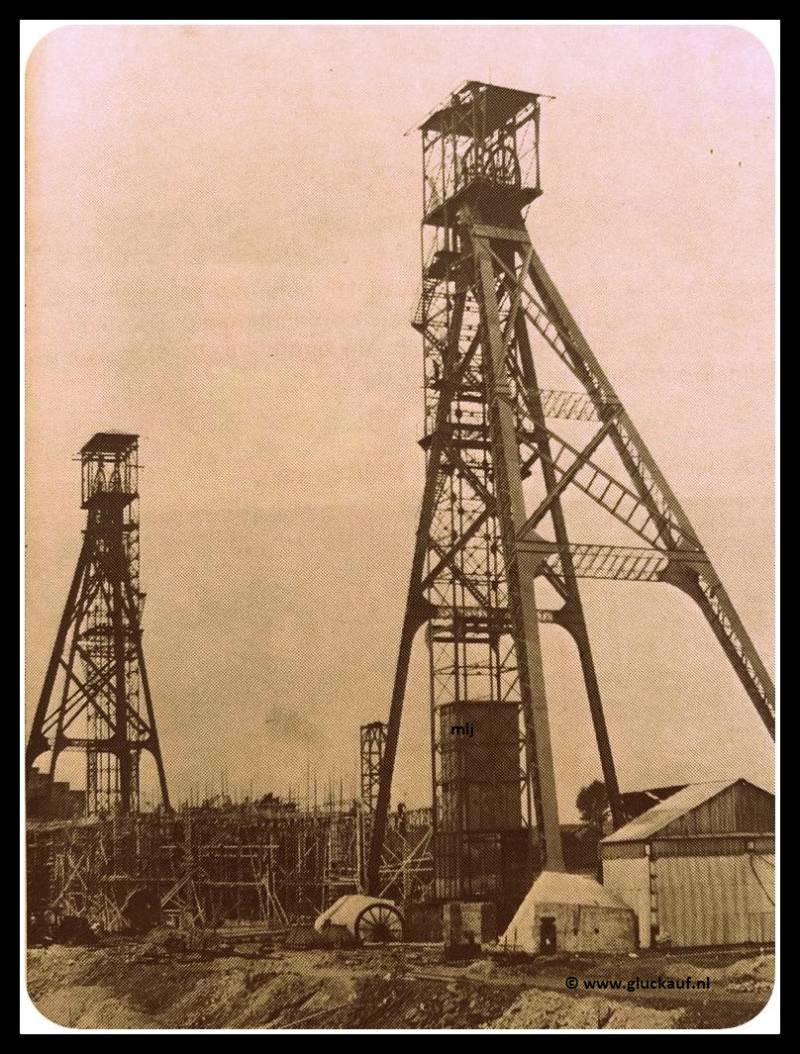 1931 met de twee oude stalen schachtbokken van schacht 1 en 2 met de oude losvloer,links ketelhuis. © Visser / www.gluckauf.nl