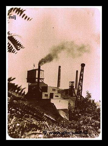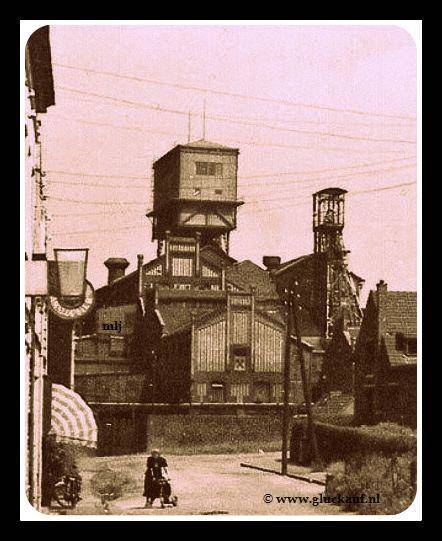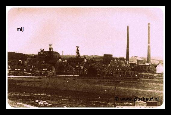 1930 met de twee oude stalen schachtbokken van schacht 1 en 2 met de oude losvloer, rechts briketfrabriek. © Visser / www.gluckauf.nl