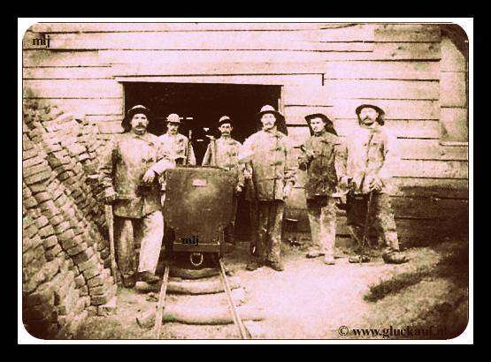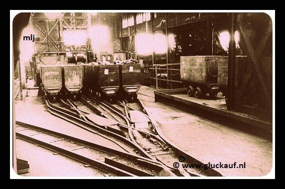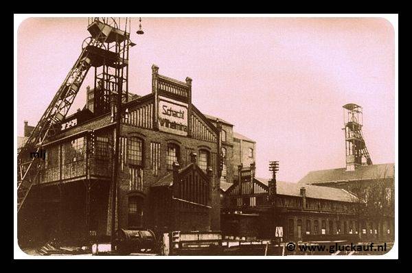 1932 losvloer van schacht Wilhelmina (schacht 1) met de oude gevel op de voorgrond en met de oude schachtbok. Van de Mijn Laura. © Visser / www.gluckauf.nl