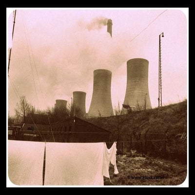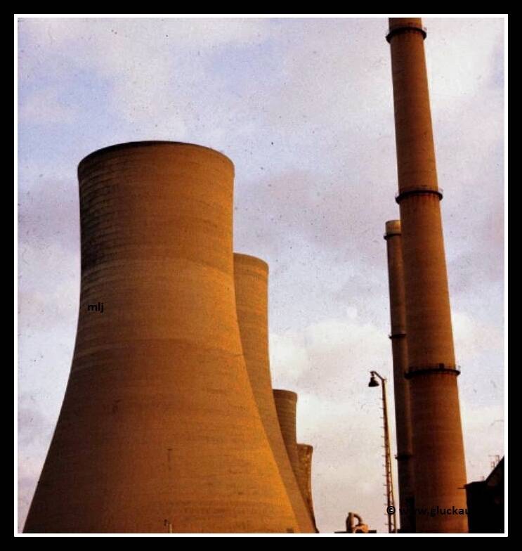 Koeltoren 6, 7, 8 en 9 en de schoorstenen Lange Lies en Lange Jan van de O.N. 1. Foto is genomen na de sluiting van de O.N. 1 in 1975.