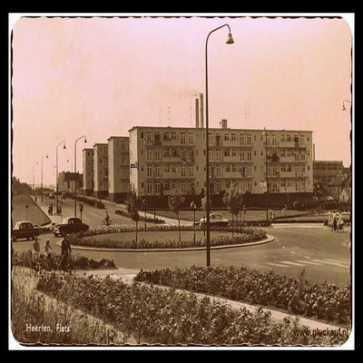 O N 1 fotokaart lange Jan & lange Lies Stationstraat Spoorweg viaduct. Op de achtergrond de Oranje-Nassau mijn I 1964.© Hema./www.gluckauf.nl