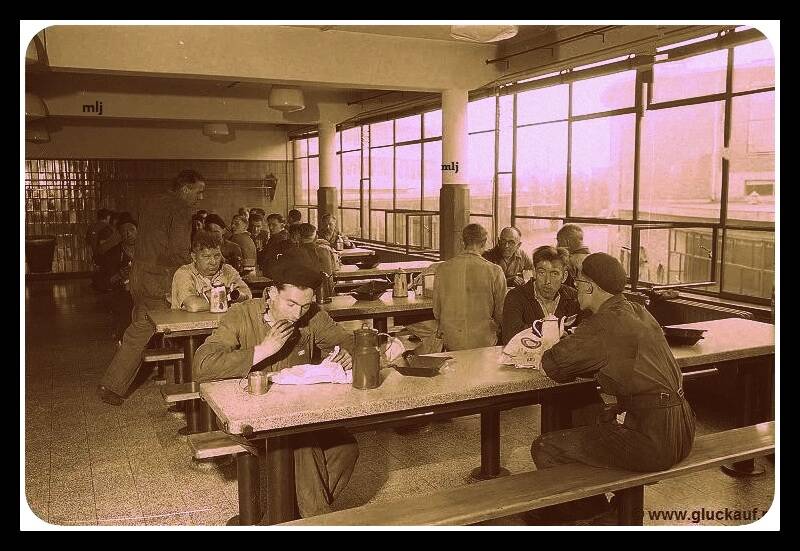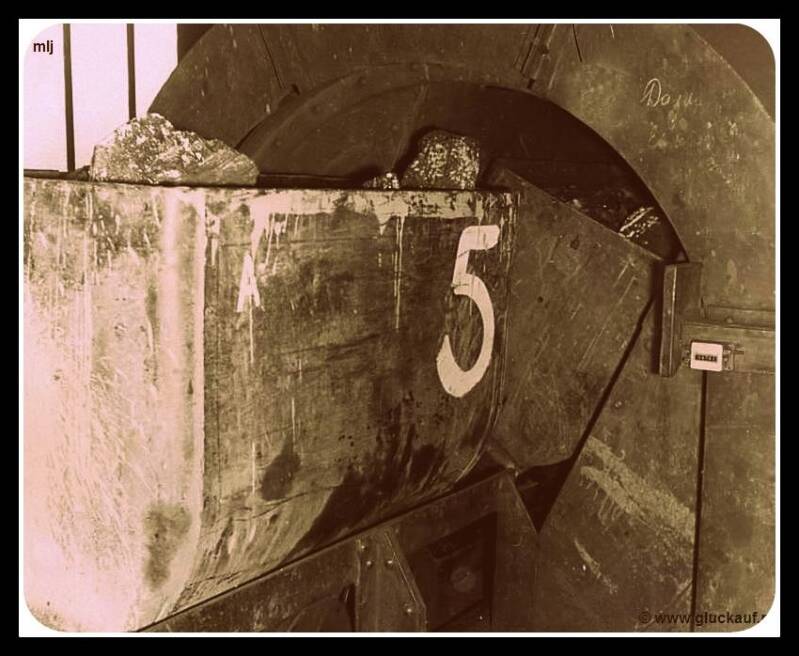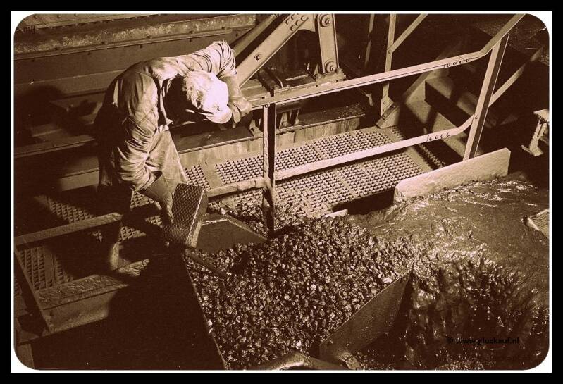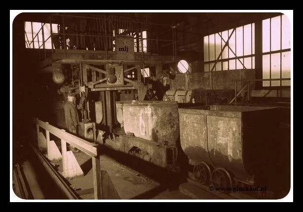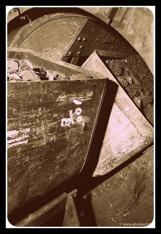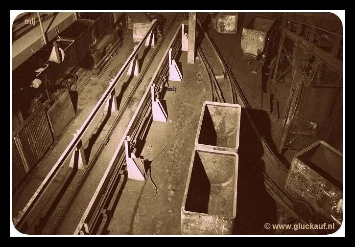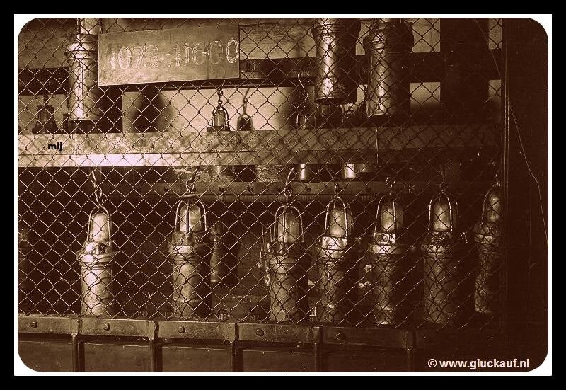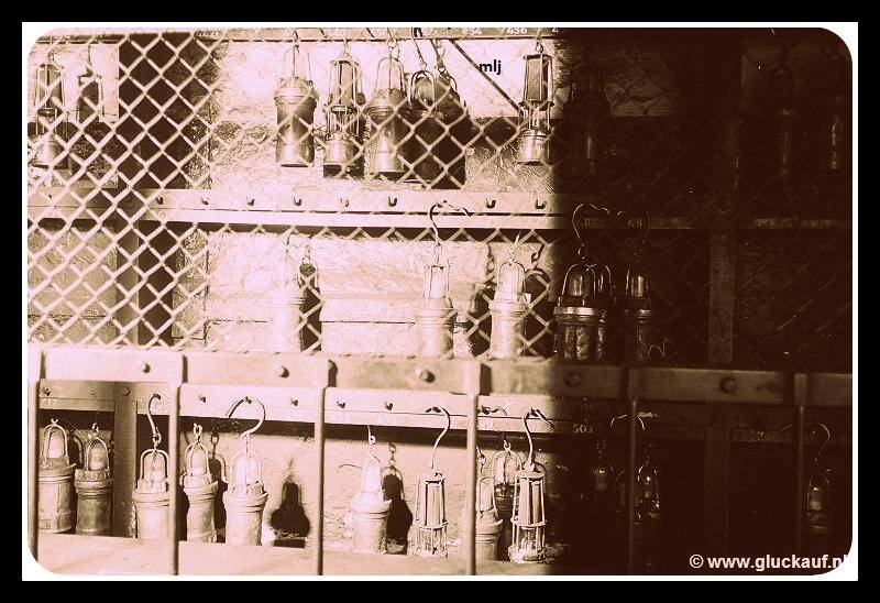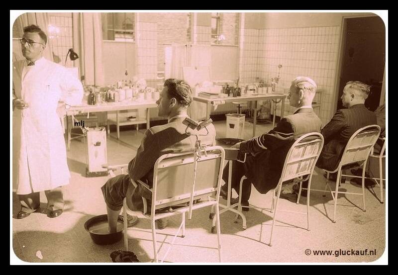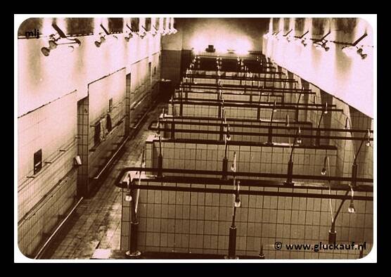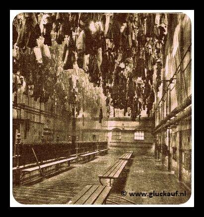 Mijnwerkers nemen na afloop van het werk een bad. Hun mijnpakken worden dan omhoog getakeld. Links de ingang naar het bad lokaal.