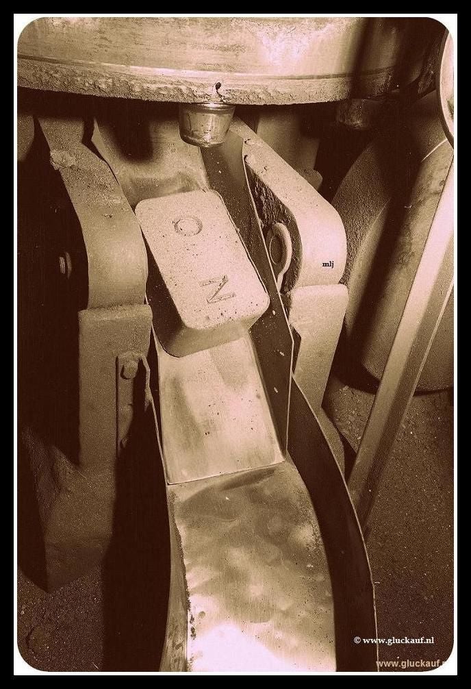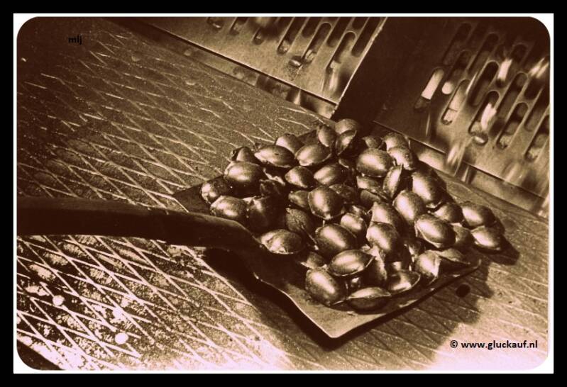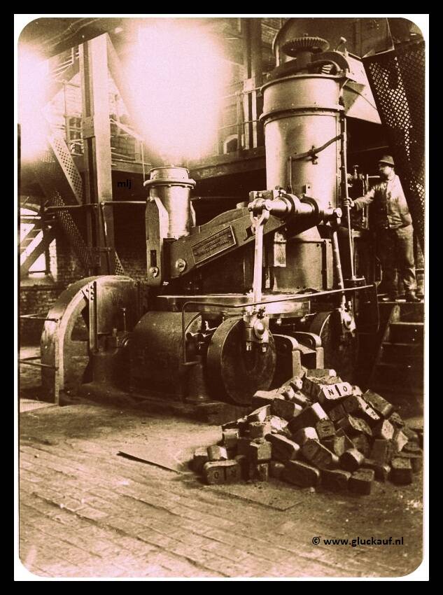 Briketfabriek van de Oranje-Nassaumijn I. Om de antraciet en magere fijn kool geschikt te maken voor huishoudelijk gebruik, werd aan de fijn kool pek toegevoegd. Dit mengsel werd tot eierbriketten geperst. Capaciteit van de eierpers 20/25 ton/uur. Diameter van de wals 1000 mm, gewicht van de eierbriket 18/45 gram, productie 1400/1600 ton per dag. in de begin jaren zestig.