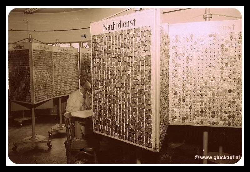 Een portier van de Oranje Nassau Mijn 1. Je ziet duidelijk de penningenborden van de nachtdienst. Uit 1952.