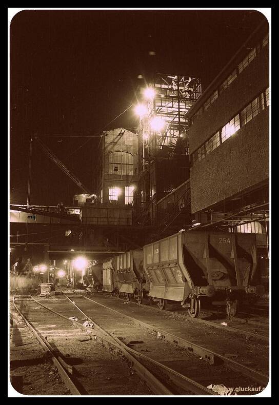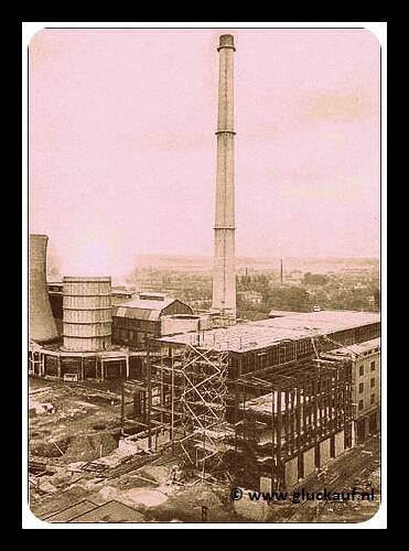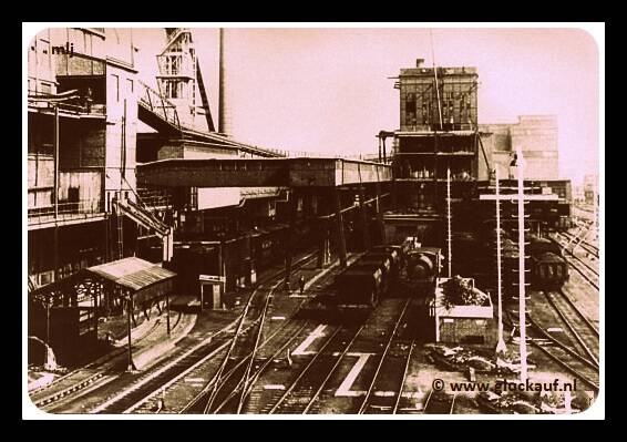 Wasserij O.N.1 uit 1926. Links wasserij AB, dan de schachtbok van schacht 3, schoorsteen ketelhuis, badcock, schoorsteen briketfabriek, en briekfabriek zelf met wasserij C.