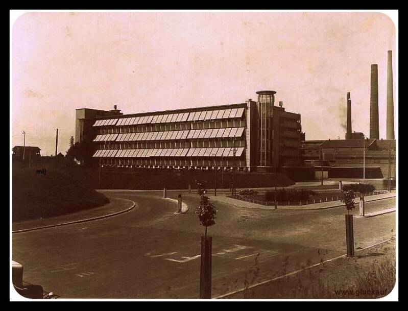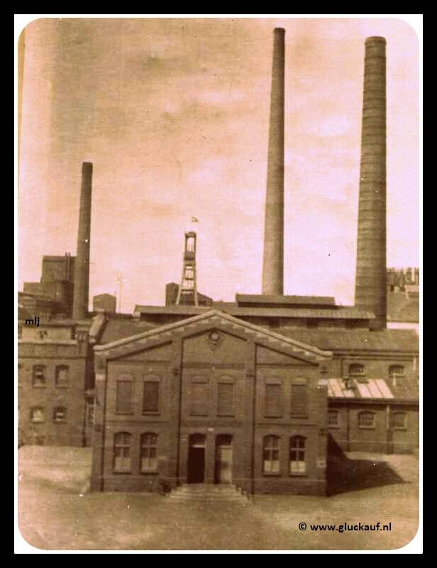 Hoofdkantoor van de Oranje-Nassau mijnen. Rechts de schoorstenen Lange Jan en Lange Lies.