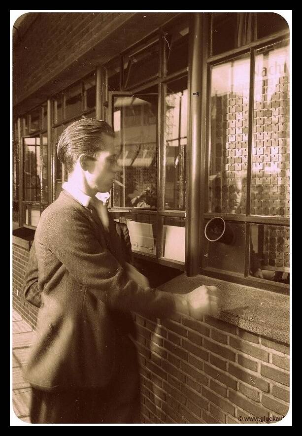 Een portier van de Oranje Nassau Mijn 1. Je ziet duidelijk de penningenborden van de middagdienst. Uit 1952.