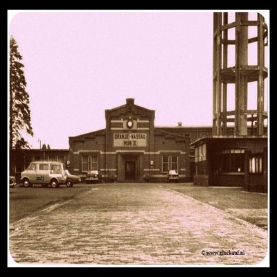 Hoofdingang van de Oranje Nassau Mijn 2, met op de voorgrond de watertoren van de Mijn.© Bos./www.gluckauf.nl