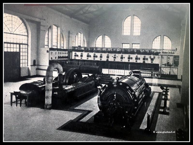 De perslucht centrale, die lage druk perslucht levert voor Afbouwhamers ,schudgootmotoren en dergelijke. Achter in het gebouw, het elektrische stroom die van de ON1 komt, wordt getransformeerd . De foto is uit 1949. © Driessen/www.gluckauf.nl