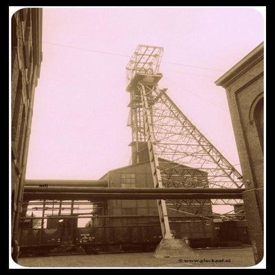 De twee schachten van de Oranje Nassau Mijn 2, je ziet ook nog een gedeelte van de voormalige fietsenstalling, uit 1952. © J.N./www.gluckauf.nl
