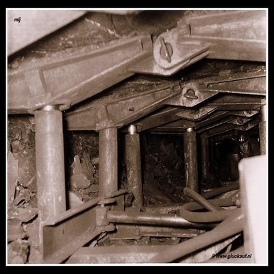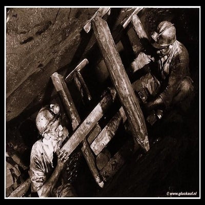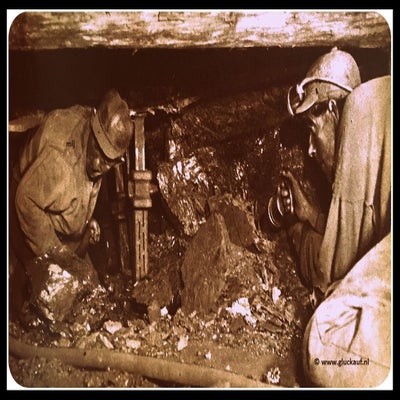 Tussen 2 gesteentepakketten in het front van post 50 loopt een 50 cm dille laag kolen. Bij begin dienst wordt de kool met Afbouwhamers gewonnen en op de band gedeponeerd . Het dak voor het front wordt daarna door een voorlopige houten betimmering gezekerd. 1947. © Cals/www.gluckauf.nl