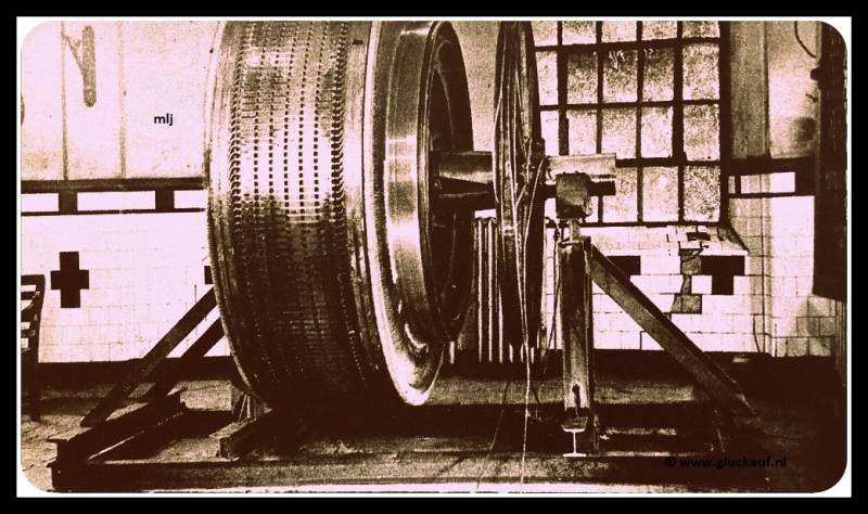 Het anker van 9 ton is in een speciale blok geplaatst . Het smalle wiel met losse kabels is de torninrichting. Van de ophaalmachine. Uit 1949. © Driessen/www.gluckauf.nl