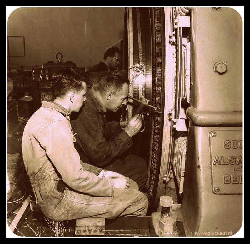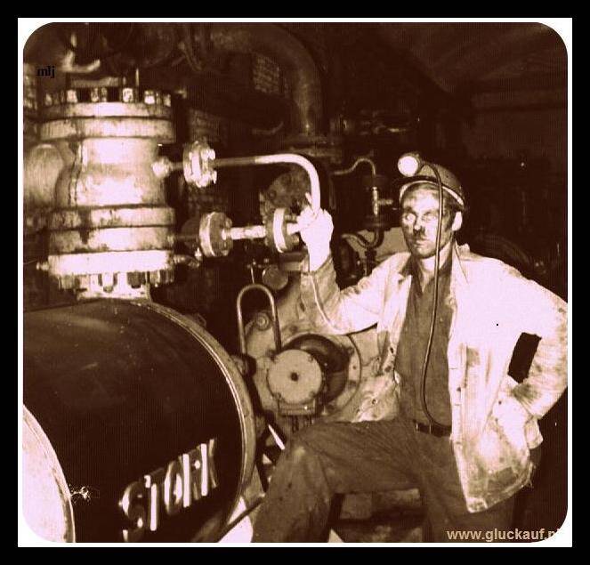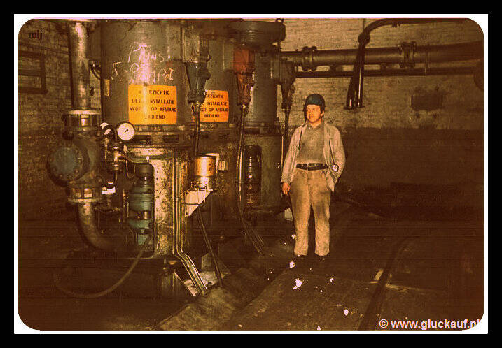 Elektricien Cor Niemantsverdriet bij de horizontale pompen op de 545 meter verdieping van de Oranje Nassau Mijn 3 in 1972. © C. Niemantsverdriet / www.gluckauf.nl