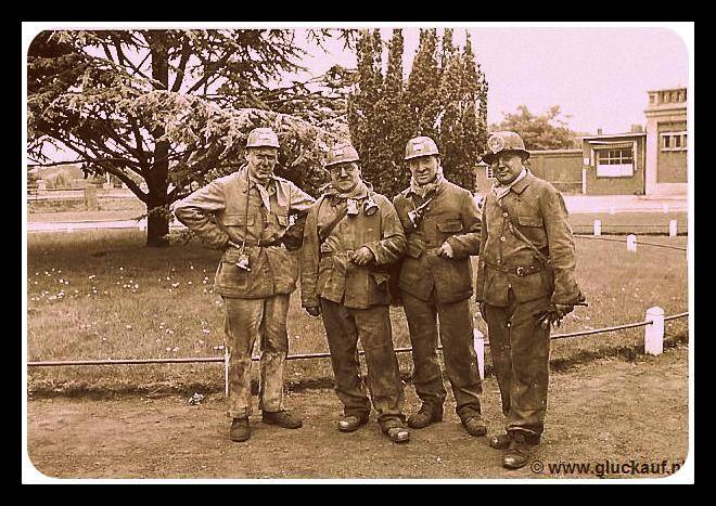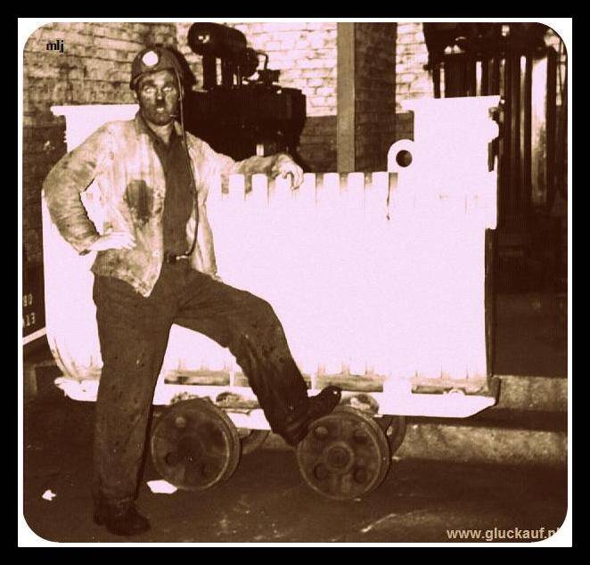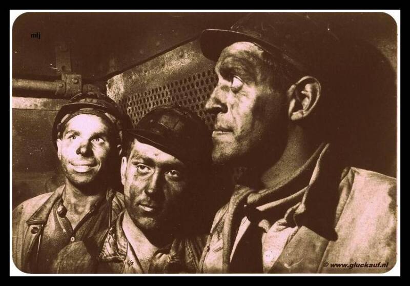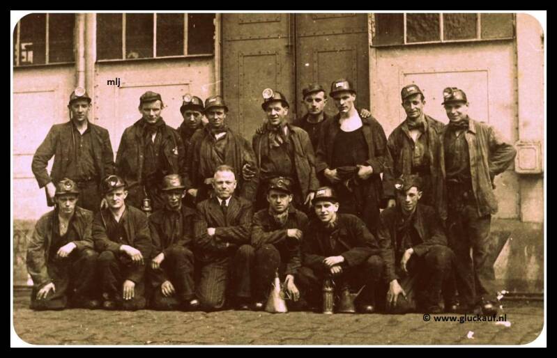 Zittend op de bank is de heer Leo Niemantsverdriet werknummer 1745, de vader van Cor Niemantsverdriet. Deze foto is gemaakt net buiten de stofmaskerruimte van de Oranje Nassau Mijn 3. © www.gluckauf.nl