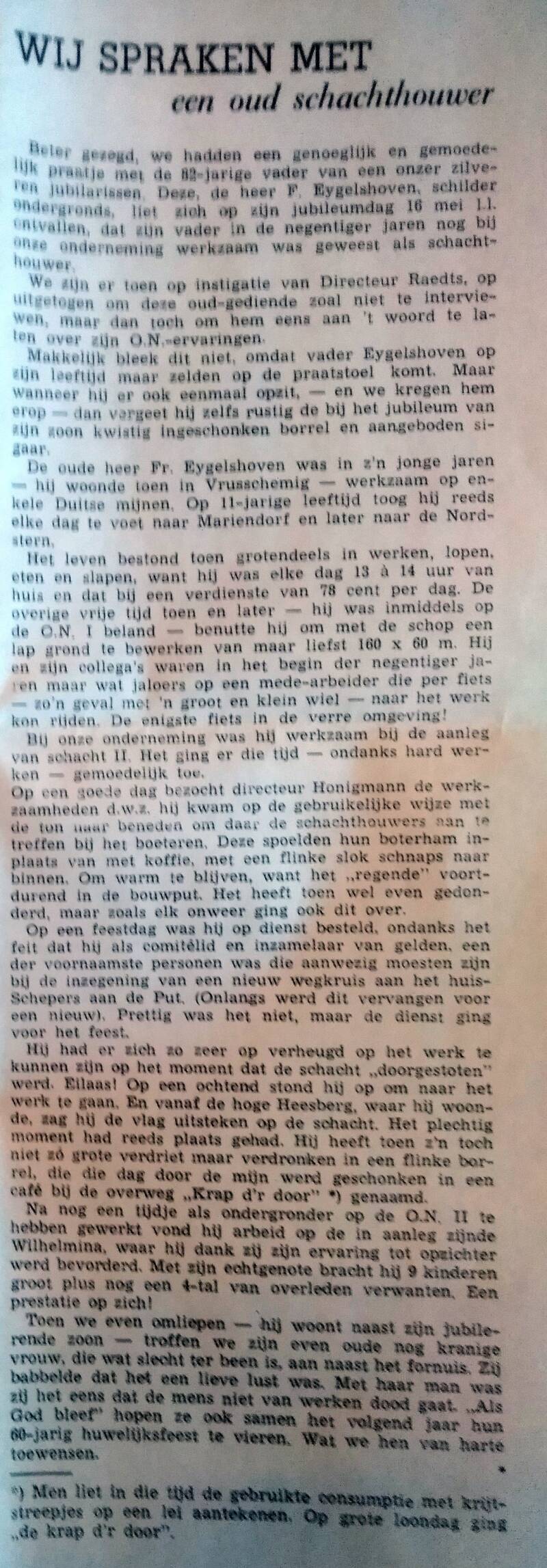 Dhr. Eijgelshoven was een van de eersten Limburgers die in de Limburgse mijnbouw actief betrokken werd. Na z'n opleiding in Altsdorf (D) waar hij leerde mijnschachten te slaan, ging hij in NL-Limburg aan de slag. Van hem heeft de overlevering nog een door zijn dochter gemaakt dienstjubileums schilderij nagelaten. (Zie hieronder foto). Op de onderstaande groepfoto, is Dhr. Eijgelshoven, Heesberg Heerlen, te zien die in 1932 zijn 25 jarig jubileum vierde, en zijn uitgereikte penning. Op de laatste foto, is een een artikel over Dhr. Eijgelshoven.