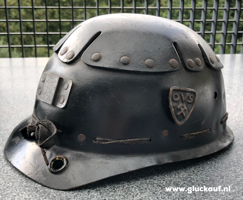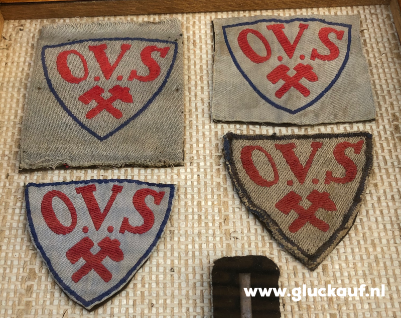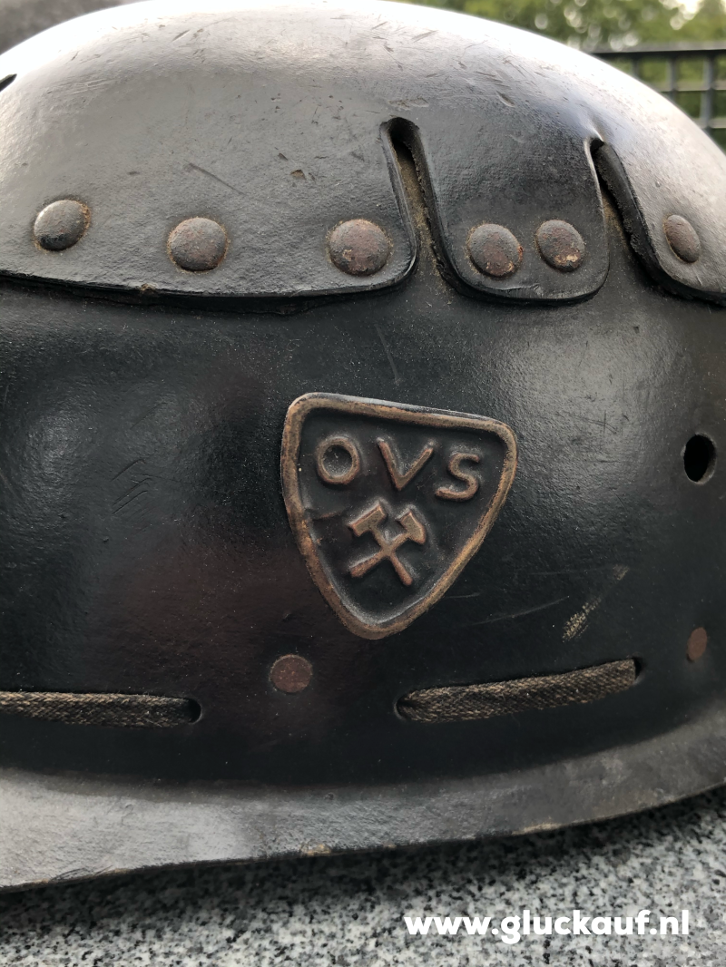 Hieronder een helm zoals men die droeg als leerling van de Ondergrondse Vakschool (OVS). Tevens enkele insignes van de OVS die de leerlingen op hun overal droegen.