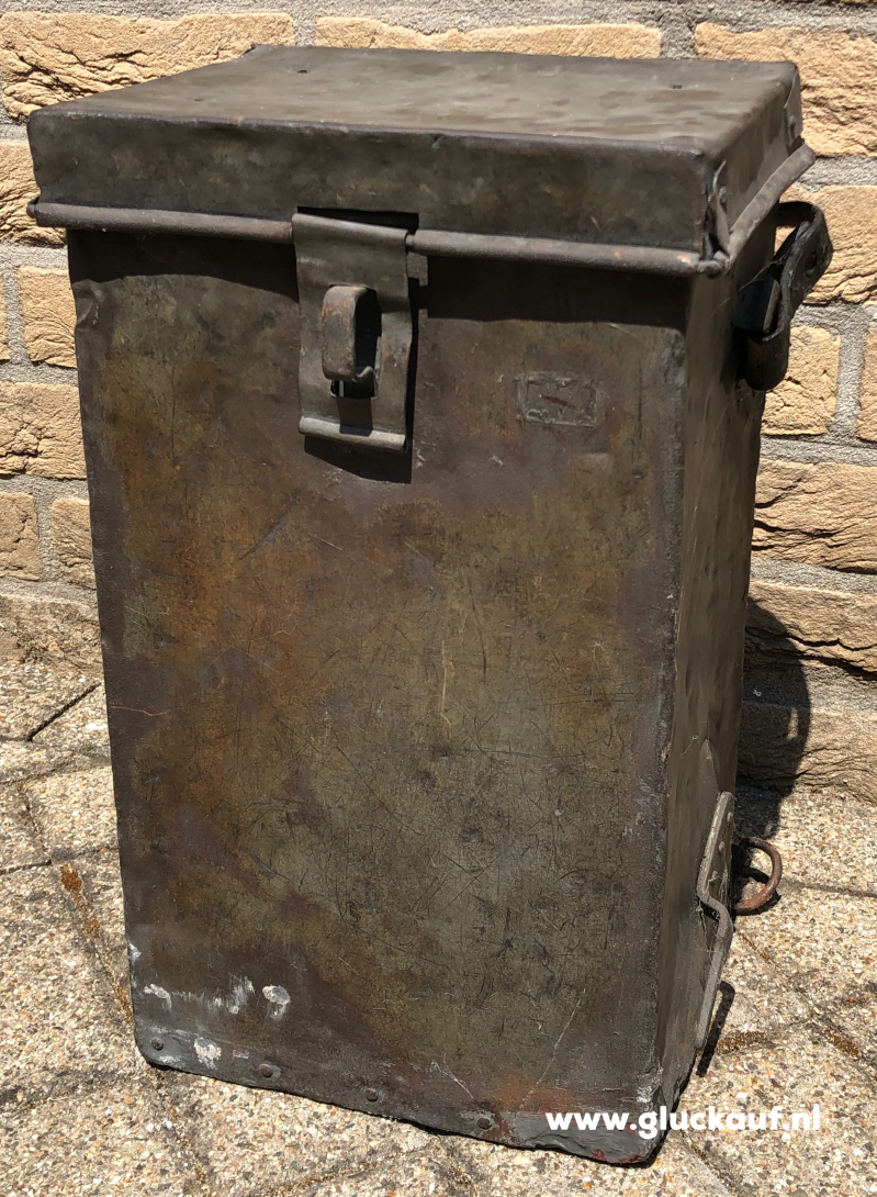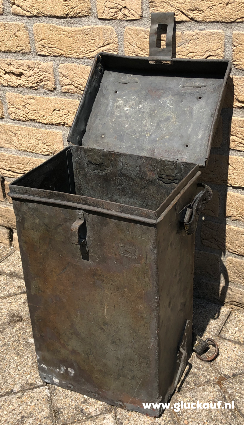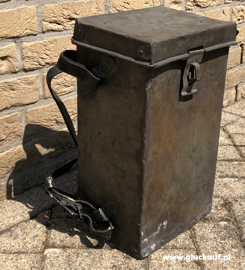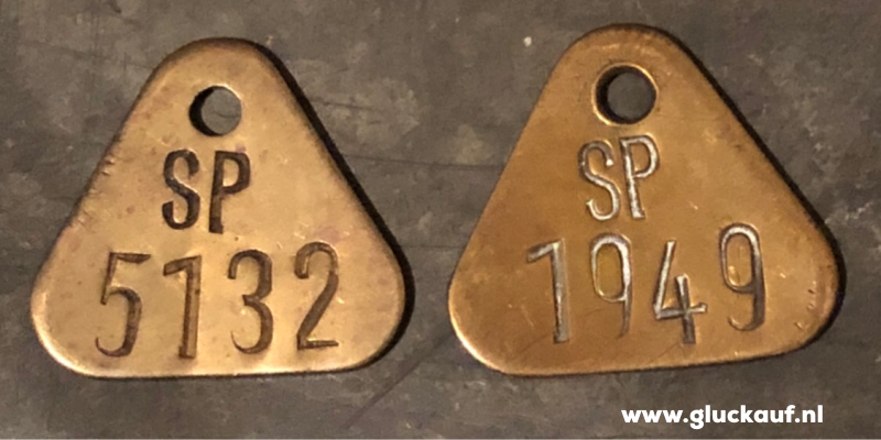 Hierboven 3 foto's van een schietkist afkomstig van de Staatsmijn Hendrik en een foto van schietpenningen. De schiethouwers deden hun dynamiet in deze kist die ze ondergronds bij het magazijn konden ophalen, hier moesten ze ook hun schietpenning inleveren. Op bovenstaande zwartwit foto staat Schiethouwer Pieter Baggen uit Nyswiller die werkzaam was op de Willem Sophia Mijn te Spekholzerheide Kerkrade.