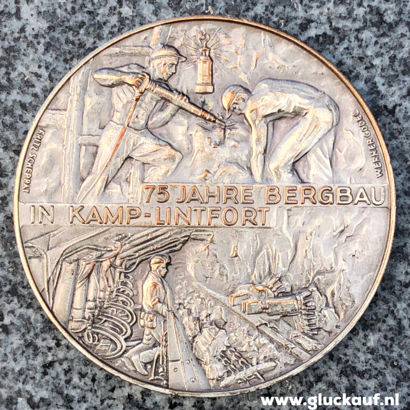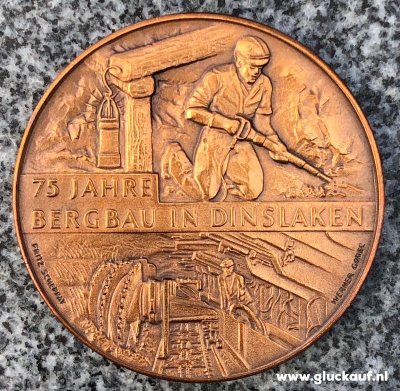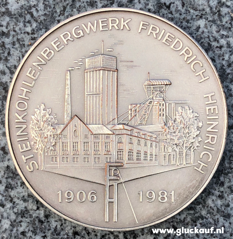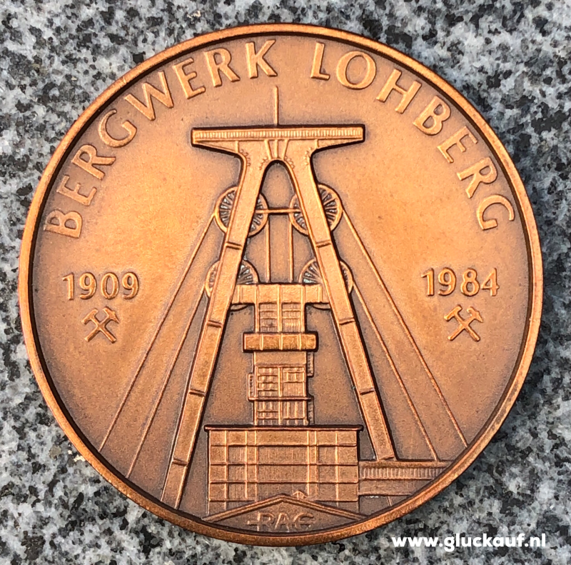 Jubileum penningen van de Duitse Steenkolenmijn Friedrich Heinrich (later ging de naam over in Bergwerk West) te Kamp-Lintfort en de Steenkolenmijn Lohberg te Dinslaken. In beide Steenkolenmijnen ben ik (Henk) ondergronds geweest. In de mijn Lohberg ben ik tot op 1350 meter diepte geweest, in de mijn Friedrich Heinrich tot 885 meter diepte.