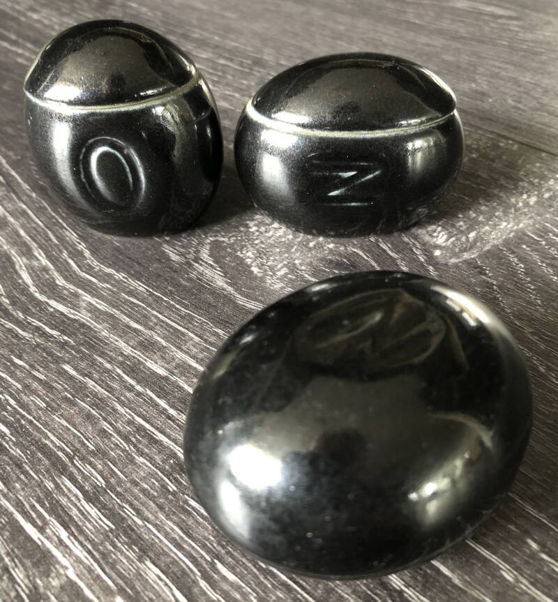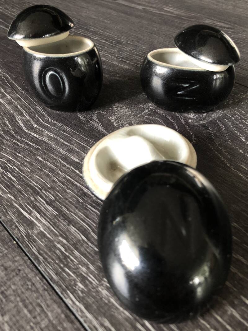 Dit zijn 3 verschillende porceleinen eierkooltjes van de Oranje Nassau Mijnen. Aan de voorzijde staat de letter "O" en aan de achterzijde de letter "N". Ze werden ooit uitgegeven als relatiegeschenk.