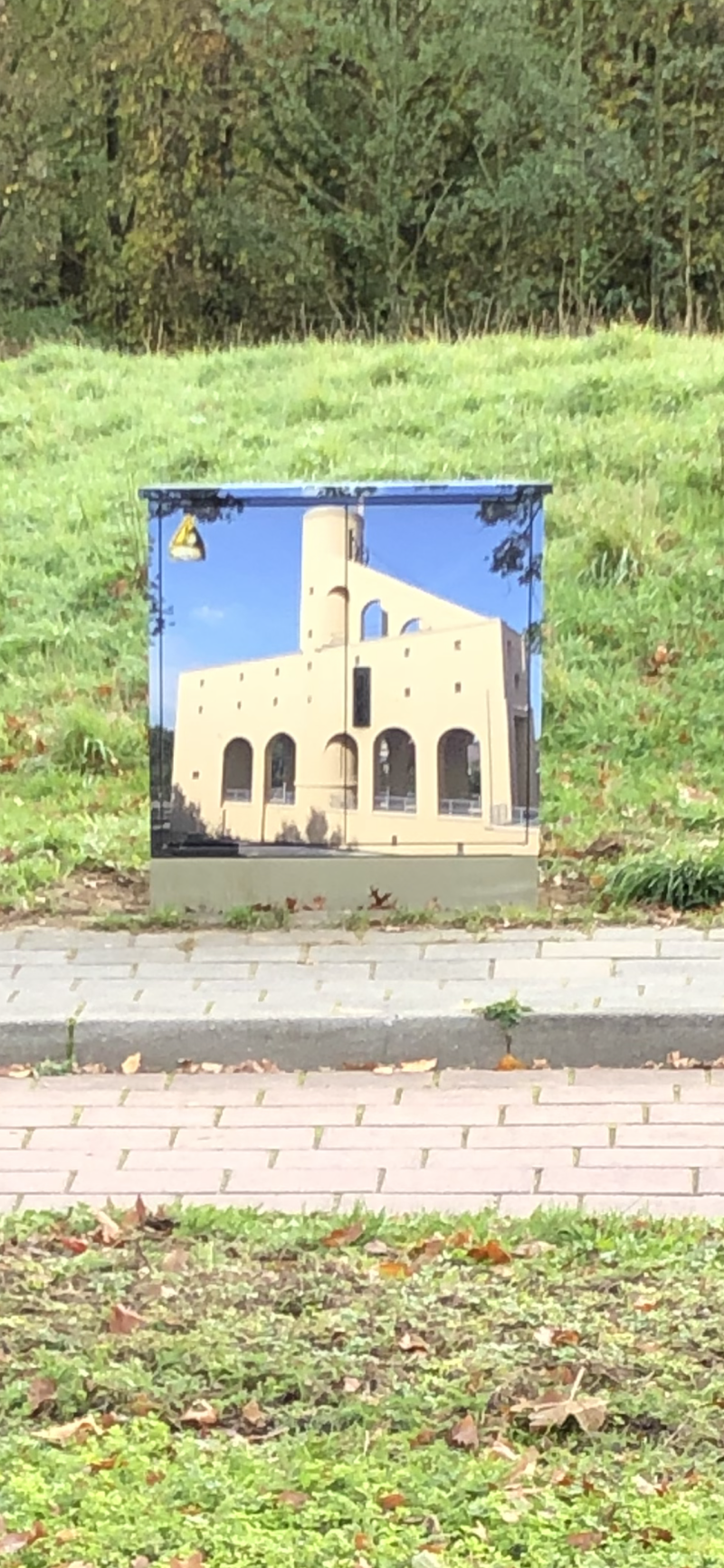 Deze elektriciteitskast gelegen aan de rotonde van de Hamstraat/Domaniale Mijnstraat is sinds vorige week voorzien van een opdruk van Schacht Nulland van de Domaniale Mijn.