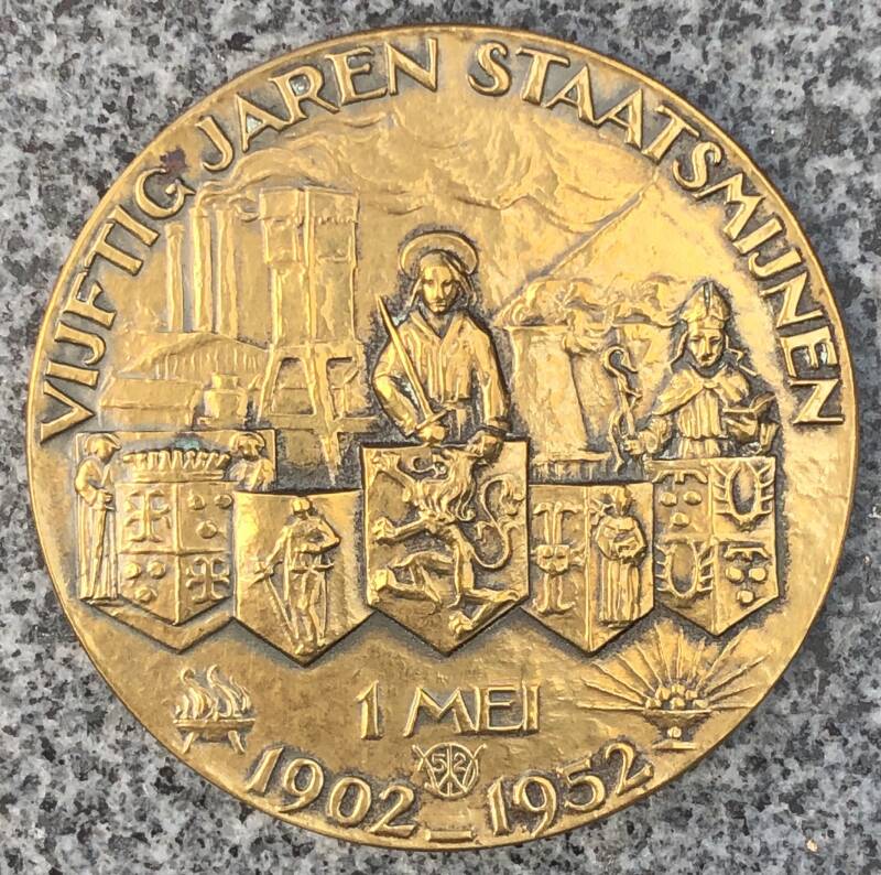 Begin mei 1952 vierde Staatsmijnen op uitbundige wijze het vijftigjarig bestaan. Het kon allemaal niet op. Er waren optochten, recepties, diners en sportwedstrijden. Met ’s Rijks Munt in Utrecht kwam Staatsmijnen overeen een gedenkpenning te laten slaan. Deze penning, in een zilveren (600 exemplaren) en een bronzen variant (300 exemplaren). De penning was bestemd voor bepaalde personeelsleden en voor relaties.