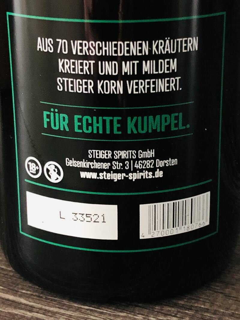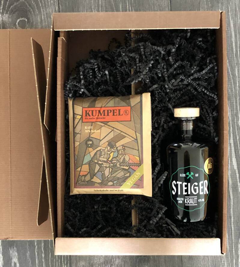 Hieronder ziet U een geschenkdoos afkomstig vanuit Duitsland. Het bevat een stuk Kumpel Schokolade aus ''m Pott en een fles kruiden likeur.