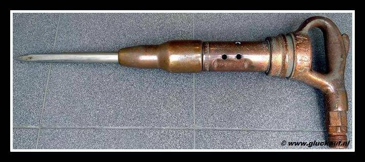 Afbouwhamer, dit is ook een modern exemplaar met aansluiting voor water (zie bovenkant). Dit was voor de stofbestrijding. Hij is van het merk Atlas Kopko en komt uit de jaren 50.