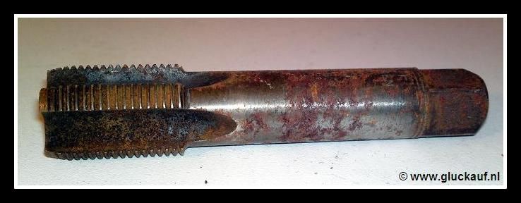 Grote steeksleutel. Er zit een gat in de steksleutel, dit was als het gereedschap werd in geleverd naar de dienst ondergronds. Ging het naar een materiaal hok, en daar werd een pin door gedaan en werd het af gesloten met een slot. Tegen diefstal werd dit gedaan.