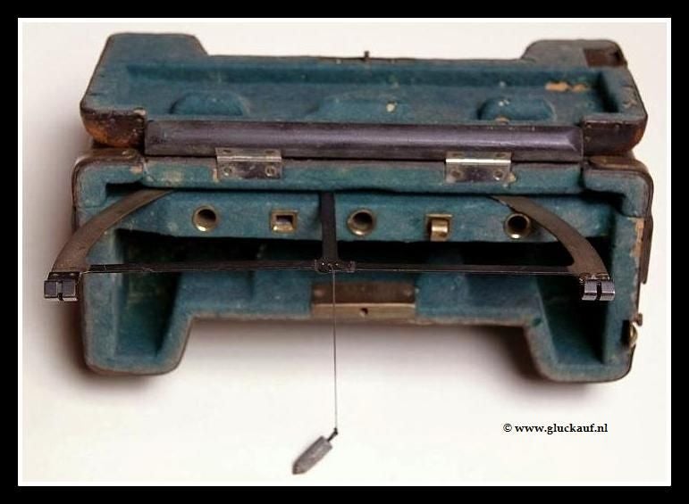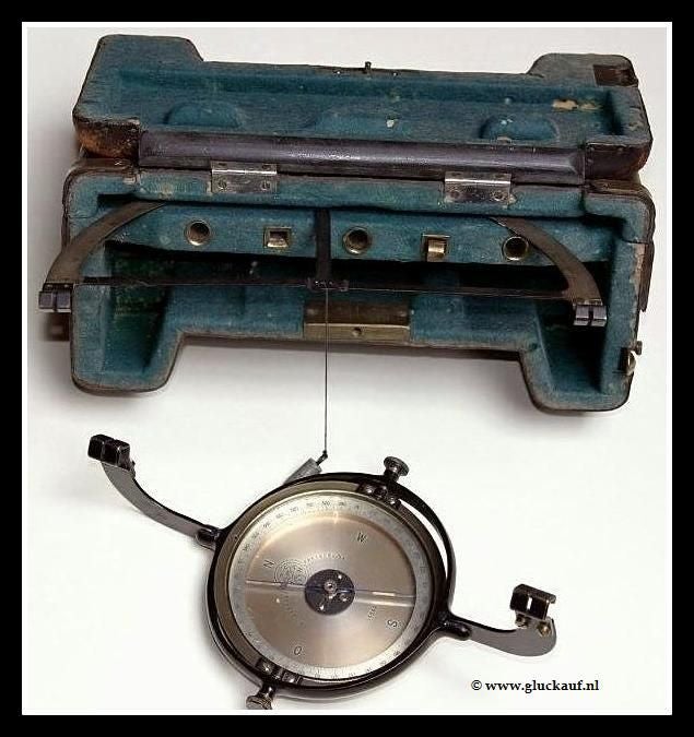 Toestel werd gebruikt door de mijnmeters voor de richting te bepalen Noord,zuid,oost,west in de hoofd steengangen en steengalerijen. Afkomstig van de Staatsmijnen.