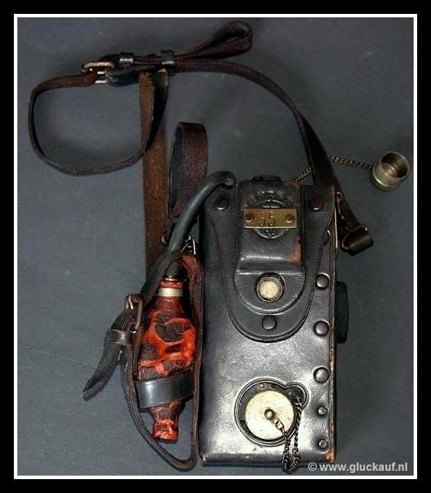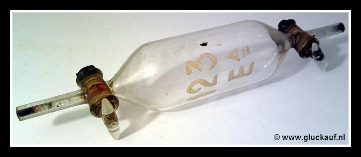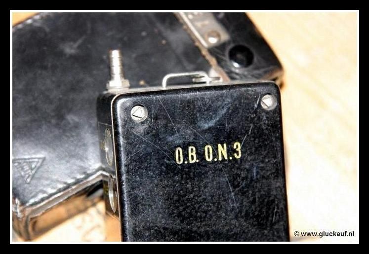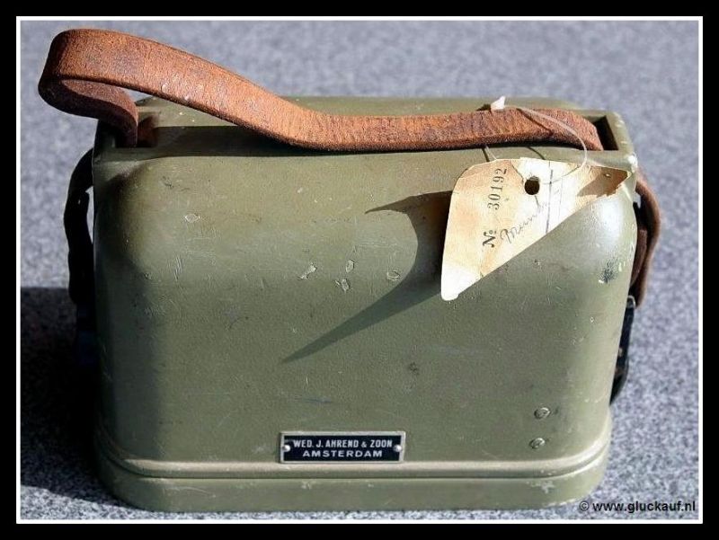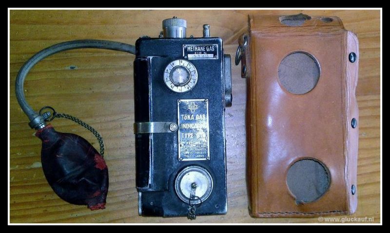 Een zeldzame Mijngasmeter uit de jaren 30 die gebruikt is op de Staatsmijnen. Het klepje op de linker foto staat open, hierdoor keek men dan. Het werkte op benzine en werd via een lontje aangestoken. Op beide onderste foto"s linksonder, recktboven de rode batterij, dat is een klein reservoir voor de benzine en links hiervan was het lont.