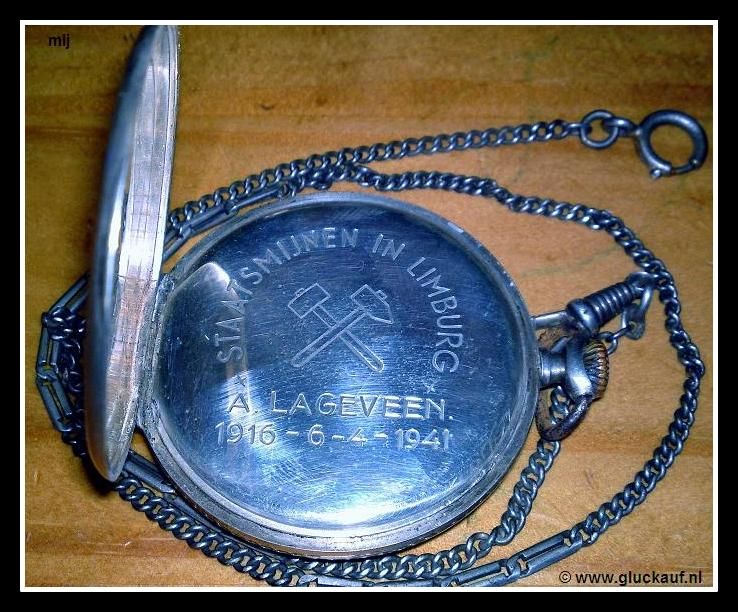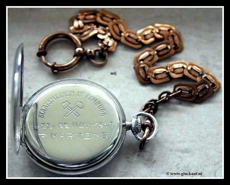 Horloge van de vader van de Heer Martens. Hierop is gegraveerd: Staatsmijnen in Limburg, 1922-22 Nov-1947, F. Martens. Tevens is hierop het mijnwerkersembleem gegraveerd.