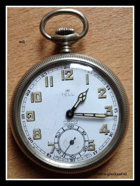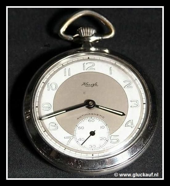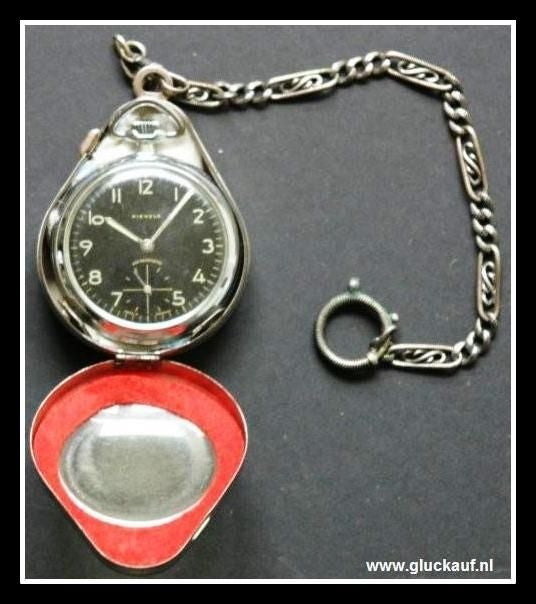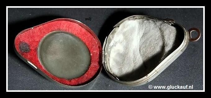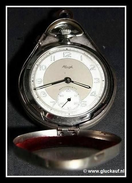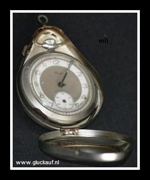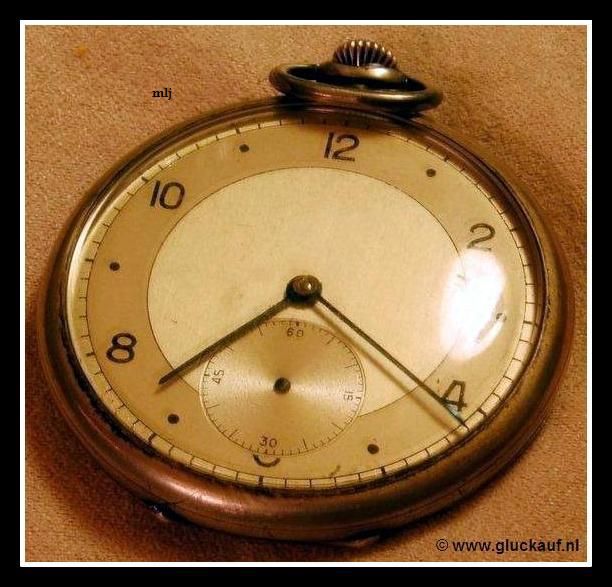 Zakhorloge met beschermdoosje, de mijnwerkers noemden het meestal "horlogekastje". Het glaasje was van "mica" omdat dit materiaal sterker was dan glas. Glas kon namelijk gemakkelijker barsten.