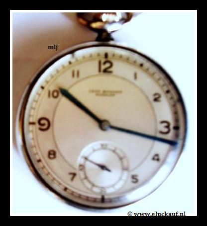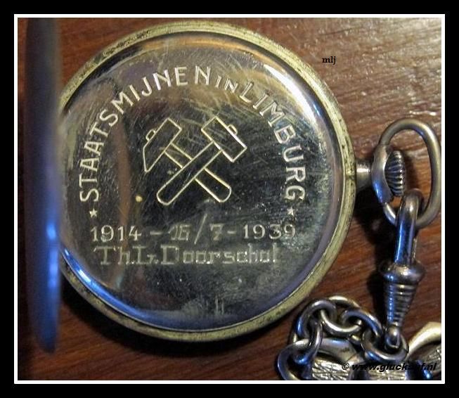 Horloge van de Staatsmijnen van de heer J.Peters, 1 maart 1913 - 1938. Dit horloge is toendertijd besteld bij de Firma Koen Eyck in Heerlen.