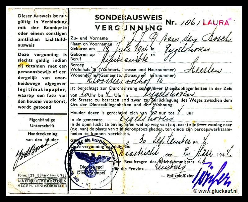 Dit een Sonderausweis vergunning uit 1944 inclusief een stempel van de Duitse bezetter die men in de oorlog nodig had om zich in de avonduren tussen 20.00 uur en 04.00 uur te kunnen verplaatsen van of naar het werk. Maar dit had men ook nodig om op het mijnterrein te kunnen komen. Deze pas was voor de particuliere mijn Laura.