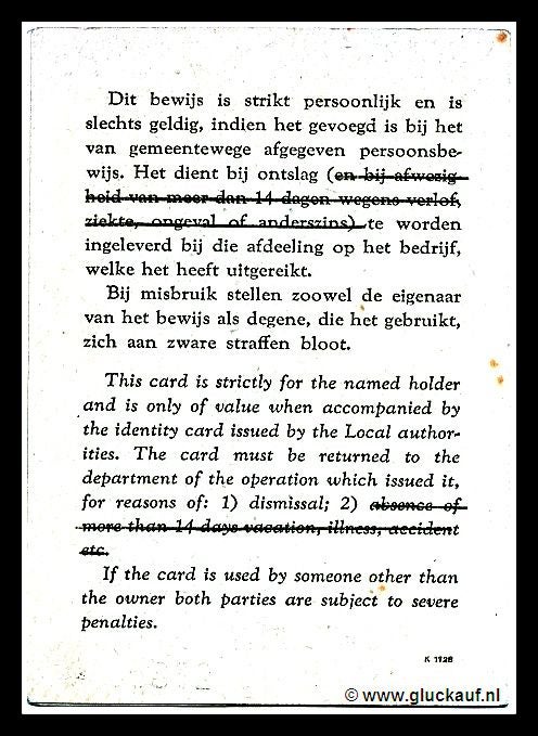 Dit is een bedrijfspas die werd uitgegeven direct na de bevrijding in 1945. Links is de voorkant en rechts de achterkant van de pas. Hieronder vind u twee foto's van de binnenkant van deze bedrijfspassen.