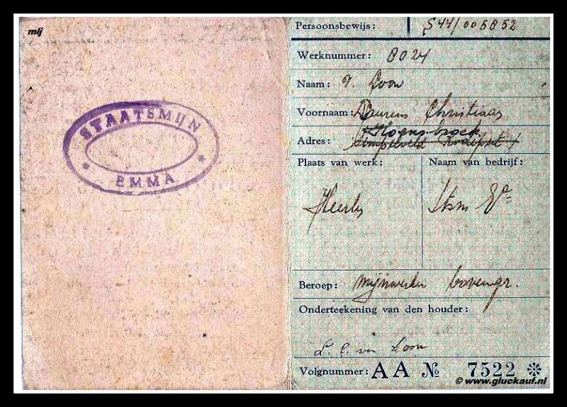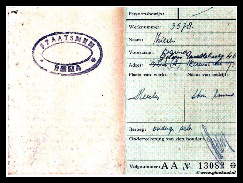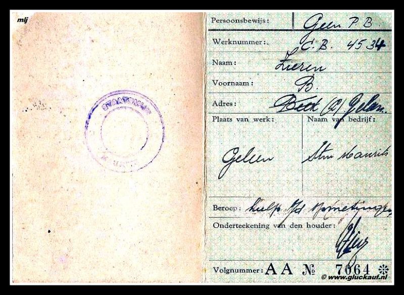 Deze Bedrijfspas werd direct na de bevrijding uitgegeven, zie stempel linksboven.( de hele regio stond nog onder militair gezag). Deze bedrijfpas was voor zowel de Staatsmijn Emma alsook de Staatsmijn Hendrik.