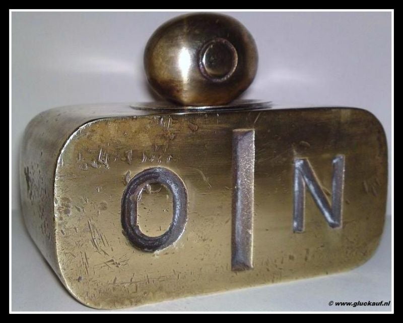 Grote bronzen kaartenhouder. Deze is afkomstig van de voormalige Oranje Nassau Mijn. De vorm is van een groot briket met daarop een kleine eierkool met de letters ON. Deze werden gebruikt als men kaarten uitrolde of tekeningen maakte zodat die niet terug rolde.