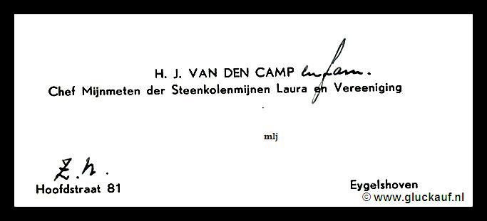 Pas in de laatste jaren van de Limburgse mijnbouw werden er zogenaamde visitekaartjes gemaakt. In die tijd was dat iets nieuws, tegenwoordig is het heel normaal als je een visitekaartje op zak hebt. Daarom zijn er maar heel weinig visitekaartjes van de steenkoolmijnen in omloop. Hieronder ziet U het enige visitekaartje dat in ons bezit is.
