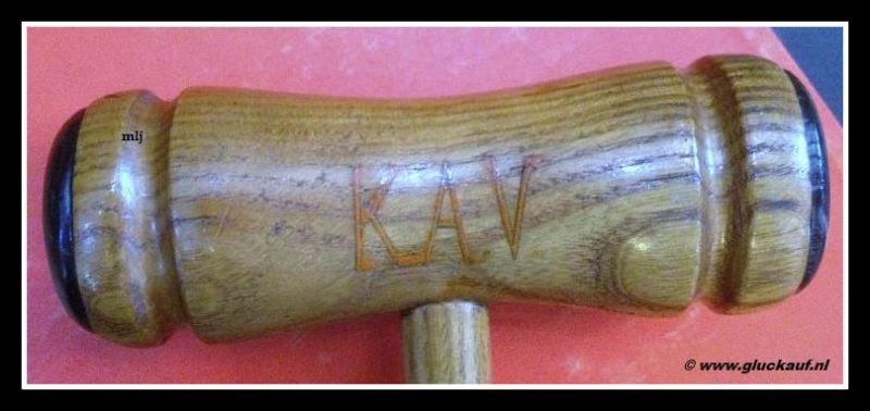 De opdruk KAV staat op de achterkant van de voorzittershamer op de rechter foto. Waarschijnlijk staat "KAV" voor Katholieke Arbeiders Vereniging.
